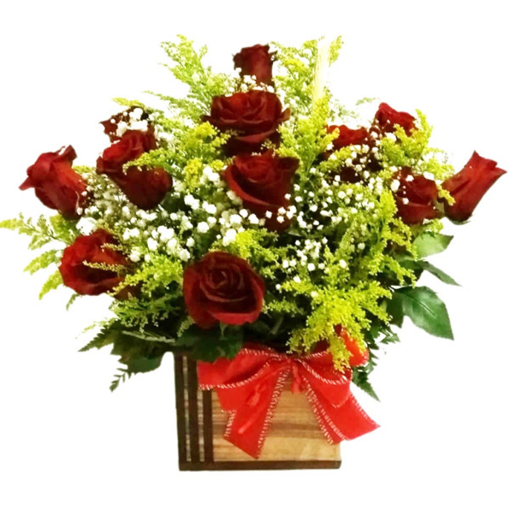 Arranjo com 12 Rosas no Cachepô de Madeira